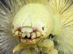 Ротовой аппарат гусениц грызущего типа. Верхние челюсти (мандибулы) всегда хорошо развитые и представляют собой сильно склеротизованные крепкие образования, варьирующие по своей форме. Их вершинный край обычно несёт на себе зубцы, служащие для откусывания или разрезания пищи. На внутреннем крае иногда могут находиться бугры, необходимые для разжёвывания пищи. Нижние челюсти (максиллы) и нижняя губа (лабиум), как и у многих других насекомых с полным превращением, слиты в единый лабио-максиллярный комплекс. Слюнные железы видоизменены в шёлкоотделительные[12].