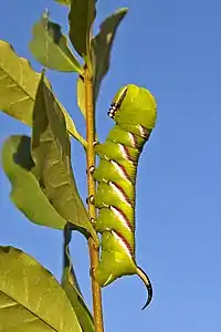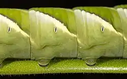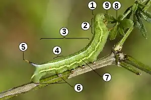 | Общее строение тела гусеницы, на примере Macroglossum stellatarum. | Строение тела гусеницы | |