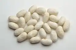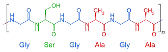 Шёлк образован белками — фиброином (75 %) и серицином, образующим поверхностный слой шёлкового волокна. Фиброин выделяется задней, а серицин — средней частью железы. Данные белки сильно отличаются друг от друга по своему аминокислотному составу. Серицин отличается от фиброина меньшим содержанием в своём составе гликокола, аланина и тирозина и значительно большим содержанием серина и диаминокислот. Шёлковое волокно сверху покрыто восковой пелликулой, по химическому составу сходной с кутикулином (белок, основной компонент наружного слоя кутикулы — эпикутикулы)[74][75].