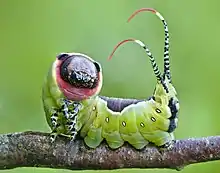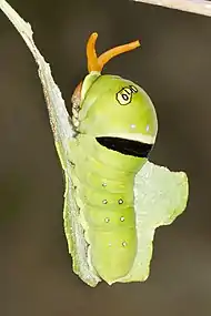 Усики (антенны) гусениц короткие, трёхчлениковые. Располагаются они по бокам головы, между глазами и верхними челюстями, в так называемой усиковой впадине. Иногда усики подвергаются редукции — происходит сокращение общего числа члеников[11].