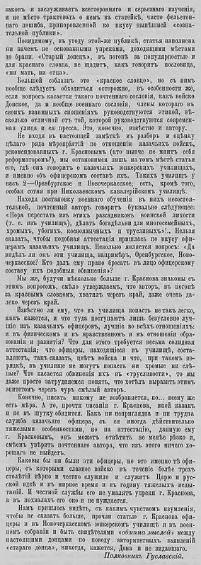 Статья из журнала «Разведчик» № 858—859 за 1907 год. Автор — начальник Новочеркасского казачьего юнкерского училища полковник Гуславский Петр Лукич.[3]