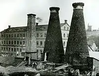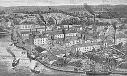 ![]() Фабричный городок около 1870 года. | ![]() Трубы заводских печей, 1883. | ![]() Фабрика и гавань в 1890-х. |