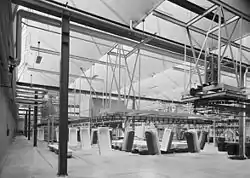 В 1946 году началось строительство ванной фабрики. Освоить производство помогла американская компания Mullins (WH Mullins Company) из Салема, штат Огайо, которая делала прессованные детали из листового металла для автомобильной промышленности США. 31 декабря 1947 была выпущена первая ванна Gustavsberg, на ней стояла подпись главы фабрики Вальдемара Вальгрена[28]. Параметры первой модели были выбраны на основе антропометрических измерений шведских призывников[29]. К июню 1948 завод наладил пресс и нанесение эмали[30]. Листовой металл сперва поставлялся из США, затем закупался у шведского Domnarvet, позднее компания нашла более лёгкие листы во Франции[31][32]. За период 1948—1954 было произведено 250 тысяч ванн[31], а самым большим клиентом стал крупнейший шведский строительный кооператив HSB[29].