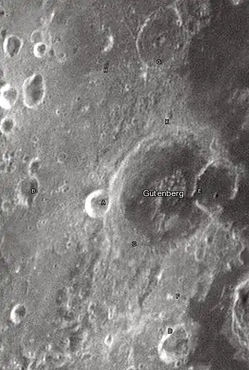- Сателлитный кратер Гутенберг A включен в список кратеров с яркой системой лучей Ассоциации лунной и планетарной астрономии (ALPO)[7] и в список кратеров с темными радиальными полосами на внутреннем склоне Ассоциации лунной и планетарной астрономии (ALPO)[8].