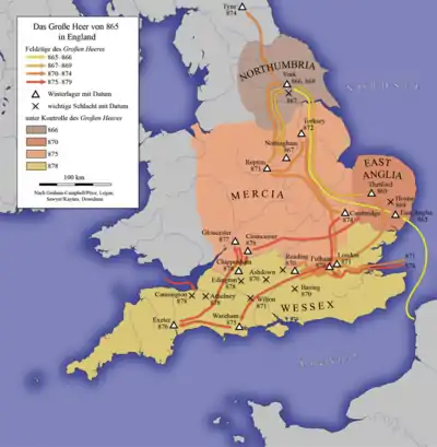 Весь 879 год войско данов провело в своем лагере в Чичестере, куда оно пришло из Чиппенхема. Здесь к ним присоединилось ещё несколько отрядов викингов, высадившихся в устье Темзы и зазимовавших в Фулеме[13]. В 880 году Гутрум выступил из Суссекса в поход на Восточную Англию. Точно неизвестно, правили ли этими землями ещё короли Освальд и Этельред II, или они уже не имели правителя, но, прибыв сюда, войско данов провозгласило Гутрума своим королём и разделило между собой земли Восточноанглийского королевства. Таким образом на территории современной Англии возникло второе, после королевства Йорвик, государство викингов и были заложены основы области датского права. Однако не всем норманнам была по душе оседлая жизнь земледельца или ремесленника и часть данов из числа тех, кто присоединился к войску Гутрума в прошлом году, отплыла для продолжения грабежей во Фландрию[14].