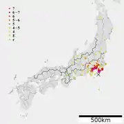 - 31 декабря 1703 года (23-й день 11-й луны 15-го года Гэнроку)[15] — Великое землетрясение годов Гэнроку (яп. 元禄大地震 Гэнроку дайдзисин)[12]; на следующий день Эдо охватил огонь[10]; часть побережья острова Хонсю пострадала от цунами; 200 000 человек были убиты или ранены[16];