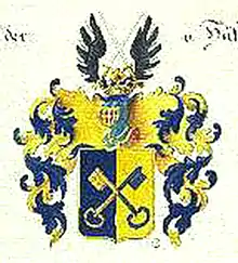Щит украшен дворянскими шлемом и короною с двумя чёрными орлиными крыльями и двумя крестообразно положенными мечами, концами вверх. Намёт на щите лазуревый, подбитый золотом.