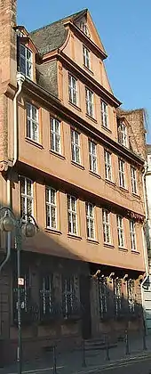 Иоганн Вольфганг фон Гёте родился 28 августа 1749 года в немецком торговом городе Франкфурте-на-Майне в доме, который ныне является музеем «Дом Гёте» (нем. Goethe-Haus) на улице Гросер-Хиршграбен. Его дед Фридрих Георг Гёте (1657—1730) переехал в 1687 году из Тюрингии и изменил написание фамилии (с Göthe на Goethe)[6]. Во Франкфурте он сначала работал портным, затем открыл трактир. На заработанное им состояние впоследствии жили его сын и внуки[7].