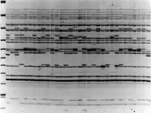 - VNTR (англ. Variable Number Tandem Repeat) — метод, получивший название ДНК-фингерпринта («отпечатки пальцев»)[2]. Тандемные повторы широко распространены в разных геномах и высокополиморфны. В результате высокой вариабельности этих участков ДНК ПДРФ-анализ с зондами к микро- и минисателитным последовательностям позволяет получать мультилокусные спектры с высоким разрешением на популяционном уровне. Благодаря очень высокому уровню полиморфизма этот подход в настоящее время является хорошим инструментом для анализа внутри- и межпопуляционной изменчивости и определения генетических расстояний между группами организмов. VNTR-аллельные варианты имеют кодоминантный характер наследования.