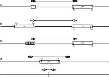 - IRAP (англ. Inter Retrotransposone Amplified Polymorphism)[12][13] — полимеразная цепная реакция между праймерами, комплементарными последовательностям двух рядом расположенных LTR ретротранспозона. Метод имеет несколько вариантов. В первом варианте IRAP используется единичный праймер из LTR. Продукты амплификации образуются между двумя инвертированными LTR с одинаковой последовательностью, то есть в одной цепи 5’-конец одного LTR ориентирован к 3’-концу другого LTR. Если центральная часть ретротранспозона длиннее обычного размера продуктов ПЦР (около 3000 пар оснований), то ПЦР будет проходить только между двумя LTR из разных ретротранспозиций. В этом случае соседние LTR должны располагаться в инвертированном положении. В другом варианте IRAP используются два разных праймера к инвертированным LTR: один праймер с 5’-конца, а другой с 3’-конца LTR, ориентированные в разные стороны от ретротранспозона. В данном случае соседние LTR располагаются как прямые длинные повторы. И, наконец, в третьем варианте IRAP используются праймеры к LTR из разных ретротрапозонов в различной ориентации. Можно комбинировать праймеры из LTR с другими праймерами из повторяющейся ДНК.