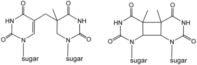 При облучении ДНК ультрафиолетовым светом в ней образуются либо циклобутановые димеры между соседними пиримидиновыми основаниями, либо пиримидиновые фотопродукты, такие как 6,4-PP. Такие соединения блокируют репликацию ДНК, и для сохранения жизнеспособности клетки их необходимо удалить. Один из способов удаления пиримидиновых димеров состоит в ферментативном превращении их в мономеры при освещении видимым светом в диапазоне длин волн 300—600 нм. ДНК-фотолиаза образует стабильный комплекс с пиримидиновым димером и, используя энергию поглощённого им света, разрушает димер без разрыва цепей ДНК.