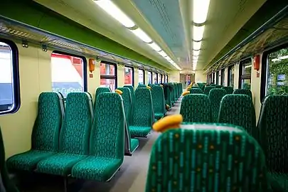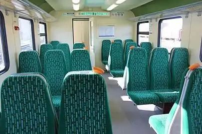 Общее число сидячих мест в головном вагоне 2 класса — 96+2 откдиных, 3 класса — 132+2 откидных; в промежуточном 2 класса — 79+1 откидное, 3 класса — 128. Общая пассажировместимость головного вагона 2 класса — 190, 3 класса — 226; промежуточного 2 класса — 143, 3 класса — 184[22][23].