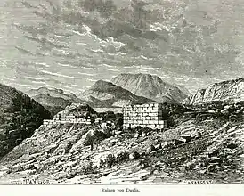Остатки стен древнего акрополя видны над современной деревней Давлией[14].
