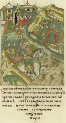 ![]() Давыд Ольгович посылает Мстислава Романовича, Ростислава Владимировича и княжича рязанского Глеба (верхний ряд) | |