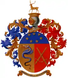 Над щитом дворянский шлем, увенчанный итальянской короной. Нашлемник: идущая вправо золотая лань. Намёт: справа — лазоревый с золотом, слева — червлёный с золотом. Девиз: «prudenter et fortiter» лазоревыми буквами на золотой ленте. Герб внесён в Часть 13 Общего гербовника дворянских родов Всероссийской империи, стр. 69.