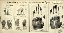 Дактилоскопи́я (от греч. δάκτυλος — палец и σκοπέω — смотрю, наблюдаю) — способ опознания (идентификации) человека по следам пальцев рук (в том числе ладоней рук), основанный на неповторимости рисунка папиллярных линий кожи. Широко применяется в криминалистике. Основана на идеях англичанина Уильяма Гершеля[1], выдвинувшего в 1877 году гипотезу о неизменности папиллярного рисунка ладонных поверхностей кожи человека. Эта гипотеза стала результатом долгих исследований автора, служившего полицейским чиновником в Индии.