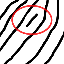 Другой тип признаков — локальные. Их называют минуциями (особенностями или особыми точками) — уникальные для каждого отпечатка признаки, определяющие пункты изменения структуры папиллярных линий (окончание, раздвоение, разрыв и т. д.), ориентацию папиллярных линий и координаты в этих пунктах. Каждый отпечаток может содержать до 70 и более минуций.
