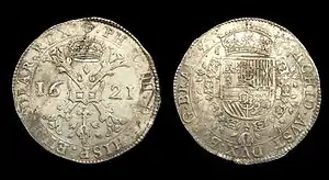 | Патагон (дальдер Альберта, альбертусдальдер, круиздальдер, крестовый) | Albertusdaalder, kruisdaalder, patagon | Южные Нидерланды | 1612—1711 | 24,65 / 28,10 | Косой бургундский крест / Герб Испании | |
