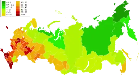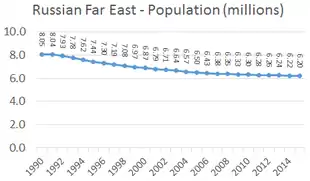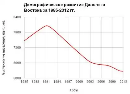 С начала 1990-х годов Чукотка потеряла две трети населения, Магаданская область — более половины, Сахалин и Камчатка — по одной трети, Амурская область и Хабаровский край — примерно по 20 %[4]. Коэффициент прироста населения на Дальнем Востоке России −4,1[5]: Приморский край −3,9, Республика Саха −1,8, Хабаровский край −1,3, ЕАО −0,7, Сахалин −7,8, Магаданская область −17,3, Камчатский край −6,2, Амурская область −6, Чукотка −14,9. При сохранении существующих тенденций Магадан останется без населения через 57 лет, а Чукотка — через 66 лет[5].