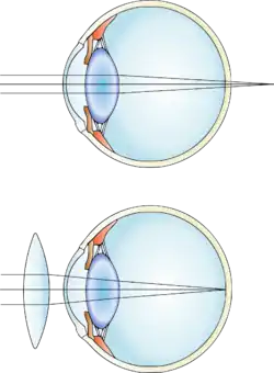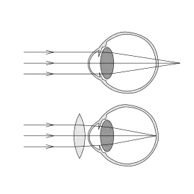 Дальнозоркость может быть исправлена при помощи как очков, так и контактных линз, чтобы изменить направление лучей света в глазу. Больные зачастую вынуждены носить очки или контактные линзы или всё время, или только для близи (читая, работая на компьютере, или выполняя другую близкую работу).