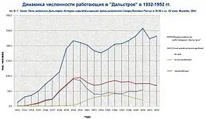 Работы в экстремальных северных условиях по освоению территории, добыче золота, руд и угля, а также развитию инфраструктуры выполнялись в основном использовавшимися «Дальстроем» в качестве рабочей силы вольнонаёмными работниками, а после подчинения НКВД, в 1938 году, заключёнными различных исправительно-трудовых лагерей (ИТЛ), разбросанных по огромной территории, подчинённой тресту.