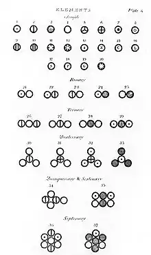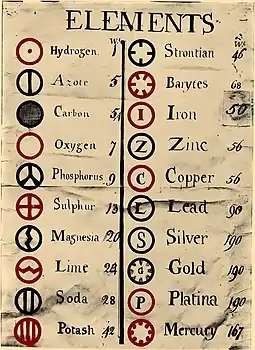 Для визуализации своей теории Дальтон использовал собственную систему символов, также представленную в «Новом курсе химической философии». Продолжая исследования, Дальтон через некоторое время опубликовал таблицу относительных атомных весов шести элементов — водорода, кислорода, азота, углерода, серы, фосфора, приняв массу водорода равной 1. Заметим, что Дальтон не дал описания способа, которым он определил относительные веса, но в его записях от 6 сентября 1803 года[16] мы находим таблицу расчета этих параметров на основе данных различных химиков по анализу воды, аммиака, диоксида углерода и других веществ.