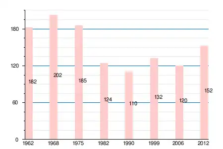 | 1962 | 1968 | 1975 | 1982 | 1990 | 1999 | 2005 | 2006 | 2010 | 2011 | 2012 |