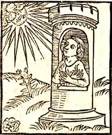 Зачастую Даная изображается заключённой в башне, поскольку именно так описали место её заключения римские поэты Овидий и Гораций. Такую Данаю мы видим и на иллюстрации к книге монаха-доминиканца Франциска де Реца «De generatione Christi, sive defensorium inviolatae castitatis» (1447—1448), который развивал христианскую трактовку её образа. Даная, со скрещёнными руками, прикрывающими грудь (в позе, в которой часто изображали Богородицу), из окна средневековой башни, тянется к антропоморфному солнцу. Солнечные лучи, как символ божественной любви, заменили здесь золотой дождь.[16]