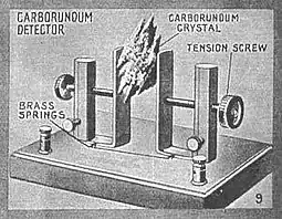 В 1906 году Данвуди стал одним из первооткрывателей электрических свойств карборунда (соединение углерода и кремния) и его повышенной чувствительности к волнам Герца[11][32][22][2]. Большое количество исследований того времени основывалось на интуиции самого изобретателя, подборе им различных материалов для обеспечения нужного контакта; большинство из них практически одновременно пришло к идее использования кристаллического материала, в их числе оказался и Данвуди[33][34]. Наиболее продуктивным исследователем оказался Гринлиф Уиттер Пиккард, который, перепробовав 30 тысяч комбинаций, пришёл к конструкции более совершенного детектора на кремнии[33]. Данвуди одним из первых запатентовал использование карборунда в кристаллическом приёмнике беспроводного телеграфного аппарата[35][36]. В его конструкции кристалл карборунда помещался между двумя жёсткими пружинами, представляющими собой медные контакты, через которые проводился тонкий провод — он принимал радиосигналы, возникавшие в точке соприкосновения кристалла с контактом, и с помощью батареи преобразовывал их в звук[37][38][39]. Изобретение недорогого, надёжного, эффективного и легко собираемого приёмника, который благодаря карборунду мог принимать даже речевые передачи, стало важной вехой в развитии радиотелефонии, значительным успехом для пионера беспроводной связи Ли де Фореста[40][22][32][34]. Де Форест одно время занимался созданием нескольких сомнительных компаний, единственной целью которых было зарабатывание денег путём продажи акций, а также и всех имеющихся беспроводных станций[37][41]. Подсмотрев несколько идей у своего коллеги Реджинальда Фессендена и потерпев от него поражение после непродолжительного судебного разбирательства, де Форест вовремя узнал о изобретении Данвуди, таким образом сумев избежать банкротства[37][42][43]. Тем не менее Данвуди так и не получил от него денег, как и Пиккард, который, по иронии судьбы, и подсказал более оптимальное расположение карборунда для получения лучшего результата[37][43][44].