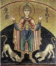 | Атрибуты | часто изображается в логове львов |