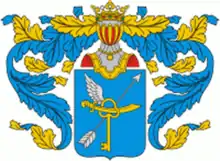 Описание герба: Выдержка из Общего гербовника В щите, имеющем голубое поле, изображен перпендикулярно золотой ключ, сквозь кольцо сего ключа продеты горизонтально золотая сабля и серебряная стрела, обращенная остроконечием к левому верхнему углу, а на поверхности ключа с правой стороны видно серебряное крыло. Щит увенчан дворянским шлемом с дворянской на нем короной. Намет на щите голубой, подложенный золотом. |