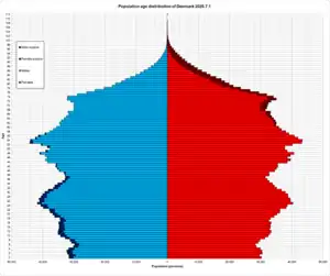 Население на второй квартал 2021 года — 5 843 347 человек[16]. Крупнейшие города — Копенгаген (1 096 187 чел.), Орхус (219 003 чел.), Оденсе (145 300 чел.), Ольборг (120 059 чел.). Средняя продолжительность жизни — 79,52 лет у мужчин, 83,51 — у женщин (2021 год).[17] Возрастной состав: до 14 лет — 16,42 %; от 15 лет до 64 лет — 63,67 %; от 65 лет и старше — 19,91 % (2020 год).[17] Средний возраст населения: населения в целом — 42 года; мужчин — 40,9 лет; женщин — 43,1 года (2020 год).[17] 1 млн учащихся. Более 2 млн семей. Из 100 семей 55 владеют собственными домами.