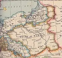 Республика Данциг (желтым) на побережье Балтийского моря. Окружено Королевством Пруссия. На юге — герцогство Варшавское.