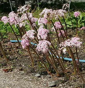 Соцветия: 30—150 см высотой, появляются раньше листьев. Цветки светло-розовые, длина тычинок — 4 мм. Время цветения: апрель—июль[4].