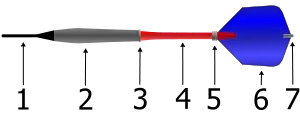 Основными частями дротика являются наконечник, баррель, хвостовик и оперение.