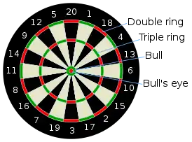 Стандартная мишень разделена на двадцать пронумерованных секторов, обычно чёрного и белого цвета, каждой присвоено число от 1 до 20. В центре находится «яблочко» (англ. bull’s eye — «бычий глаз»), попадание в которое оценивается в 50 очков. За попадание в зелёное кольцо вокруг него — 25 очков. Внешнее узкое кольцо означает удвоение числа сектора, внутреннее узкое кольцо означает утроение числа сектора. И внешнее, и внутреннее узкие кольца традиционно окрашиваются в красный и зелёный цвета.