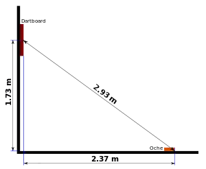 В стандартной игре центр мишени должен находиться на высоте 1,73 метра (5 футов, 8 дюймов) от пола, а расстояние от лицевой стороны мишени до линии, с которой игроки метают дротики, составляет 2,37 метра (7 футов, 9,25 дюйма).