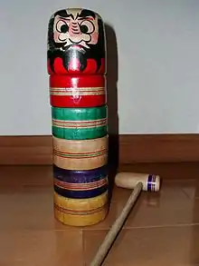 Дарума Отоси (яп. 達磨落とし) — традиционная японская детская игра, требующая хорошего глазомера и рефлексов. В начале игры ставится ровная башенка из пяти частей: головы Дарумы наверху и четырёх цветных блоков снизу (синего, зелёного, жёлтого и красного цветов). Иногда блоков бывает больше. Цель игры — специальным молоточком выбить по одному все блоки из-под головы так, чтобы она при этом не упала[9].