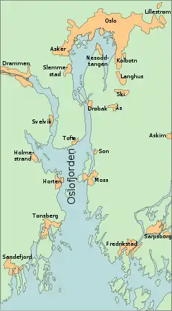 Успех и быстрота захвата Осло были крайне важны для немцев как в военном, так и политическом планах, однако именно этот десант оказался для них самым неудачным[49]. Половина 324-го пехотного полка 163-й дивизии должна была перелететь на аэродром Осло-Форнебю после того как его захватит рота парашютистов; вторая половина полка планировала высадиться в порту Осло с кораблей 5-й десантной группы[50]. В неё входили тяжёлые крейсеры «Блюхер» (флагман контр-адмирала Куммеца, на нём также находился штаб дивизии генерал-майора Энгельбрехта) и «Лютцов», лёгкий крейсер «Эмден», 3 миноносца, 8 тральщиков и 2 вооружённых китобоя[50]. После прохождения прожекторного заграждения между Болаерне и Рауёй, были направлены штурмовые группы для захвата этих укреплений и главного военного порта Норвегии, Хортена[50]. Рассчитывая, что серьёзного сопротивления оказано не будет, Куммец решил прорваться через самое узкое место Осло-фьорда, проход Дрёбак[51]. У северного выхода из прохода находился остров-форт Оскарсборг[51]. В 5:20 неожиданно для немцев две батареи форта открыли перекрёстный огонь из 280-миллиметровых орудий по шедшему первым «Блюхеру» с дистанции 500 метров[51]. На крейсере сразу отказала система управления огнём и начались пожары; маневрируя, он вёл беспорядочный огонь из зенитных орудий[52]. В это время корабль получил две торпедные пробоины от превосходно замаскированной береговой торпедной установки в Кахольме[52]. В 7:23 «Блюхер» затонул на 90-метровой глубине в 400 метрах от берега[52]. Несмотря на отсутствие большей части спасательных жилетов и шлюпок, разлившееся горящее топливо и ледяную (3 градуса по Цельсию) воду, большинство моряков и солдат смогли добраться до берега; там они на непродолжительное время попали в норвежский плен[52]. «Эмден» и «Лютцов» задним ходом вышли из прохода, после чего принявший на себя командование капитан Тиле («Лютцов») решил высадить пехоту в Сонбуктене, чтобы поддержать с суши прорыв Дрёбака[53]. В это время в боях за Рауёй и Хортен были потоплены немецкий катер-тральщик R-17 и норвежская субмарина A-2; норвежский адмирал сдал порт[53]. Вечером люфтваффе атаковало Дрёбак и Оскарсборг; с батареями в Осло-фьорде велись переговоры о сдаче[53]. Немецкие корабли вошли в порт Осло только утром 10 апреля[53].