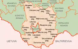 Бикерниекская волость Вабольская волость Вецсалиенская волость Вишкская волость Деменская волость Дубнинская волость Калкунская волость Калупская волость Лауцесская волость Ликсненская волость Малиновская волость Медумская волость Науенская волость Ницгальская волость Салиенская волость Свентская волость Скрудалиенская волость Таборская волость | |||||
