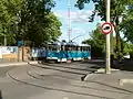 - 4-й маршрут. Синий. Начально ожидался в 2020 году. До осени 2021 года "Хлебный комбинат-Станция-Хлебный комбинат", с 18 по 21 мая 2021 года уложены вторые стрелки для съезда[19].[20] Возник первый треугольный съезд трамвая в 2020 году. Потом называли время пуска ноябрь 2021 года[14], ранее несколько раз сдвигали пуск.