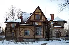 Здание двухэтажное, на подвалах, с высоким каменным цоколем, деревянное, частью — кирпичное, сложной объёмно-пространственной композиции из разновеликих объёмов. Основной объём здания деревянный, отделка фасадов, имитирующая фахверк, выполнена обшивкой стен доской или «вагонкой», штукатуркой и окраской. В северо-восточной части здания — объём внешнего тамбура, парапетное ограждение террасы, угловая стилизованная башня — сложены из кирпича. В отделке фасадов применены разнообразные материалы: бутовый камень, облицовочная керамическая плитка «кабанчик», известняк, дерево, керамическая черепица, поливные полихромные изразцы.