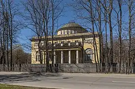 По проекту Шустова в 1831—1833 было построено квадратное в плане деревянное здание с ротондой в центре и двумя парадными лестницами по бокам от вестибюля, который перекрывался пологим куполом. Три фасада (южный, западный и восточный) были украшены портиками с шестью колоннами, а по центральному фасаду с двух сторон от портика были полуциркульные окна[1].
