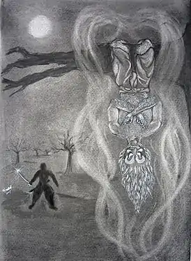 Между тем демон Ветала, сидящий в трупе, начинает рассказывать царю, несущему труп, остроумную сказку, по окончании которой спрашивает его, кто из действующих лиц сказки должен считаться виноватым, и грозит, что в том случае, если не получит ответа, он растерзает царю сердце. Как только царь отвечает, труп повешенного вырывается из его рук и вновь висит на дереве, так что царь должен за ним возвращаться[2].