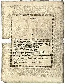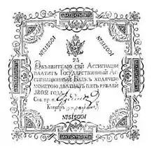 Выпуск двадцатипятирублёвых ассигнаций был начат при Екатерине II в соответствии с манифестом от 29 декабря 1768 (9 января 1769) года[1].