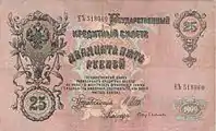 При Николае II первый выпуск банкнот номиналом 25 рублей был в 1898 году. Второй выпуск в 1909 году. Банкноты печатались на бумаге розового цвета, размером 178×108 мм. На лицевой стороне банкноты было изображение Александра III, на оборотной — номинал цифрами и прописью, герб Российской империи[2].