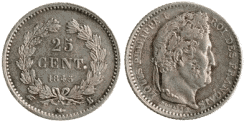Чеканка серебряных монет в 25 сантимов, пришедших на смену выпускавшимся в 1803—1845 годах монетам в четверть франка, начата в период правления Луи-Филиппа I в 1845 году. Рисунок новой монеты был аналогичен рисунку монеты Луи-Филиппа в 1⁄4 франка, чеканившейся в 1831—1845 годах, автором которой был Жозеф-Франсуа Домар. После революции 1848 года чеканка была прекращена[1].