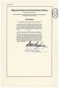 В 1959 году проект поправки внесен сенатором штата Теннесси Эстесом Кефаувером и звучал как предоставление губернаторам права заполнять вакансии в Палате представителей «в любую дату, когда общее количество вакансий ... превышает половину утвержденного членства». Одновременно поданы предложения поправок к Конституции США о запрете ограничения избирательных прав ввиду неуплаты налога (внесена Спессардом Холландом) и предложением Кеннета Китинга гарантировать штату Колумбия права на президентских выборах и наличие делегатов без права голоса в Палате Представителей. Все три предложения направлены в Палату представителей, где Эмануэль Целлер предложил другое прочтение текста поправки, который в дальнейшем принят без изменений, однако подвергался критике как слишком ограниченный, узкий. На что Целлер парировал что данная поправка с большей вероятностью будет ратифицирована, и он отдельно поддержит предложенную поправку Холланда (в дальнейшем принятую как XXIV поправка). Палата представителей проголосовала за принятие поправки 14 июня 1960 года, Сенат согласился с принятием поправки голосованием 16 июня 1960 года. Поправка ратифицирована в течение 9 месяцев, когда Нью-Гэмпшир отменил ратификацию поправки 29 марта, и вновь ратифицировал её на следующий день, став 38-м штатом из одобривших поправку, обеспечив необходимые 3/4 для её вступления в силу[4].