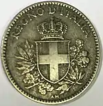 При Умберто I (1878—1900) 20 чентезимо перестали чеканить из серебра. Первый в истории Италии выпуск медно-никелевых монет был вначале осуществлён на монетном дворе Берлина. Впоследствии процесс наладили и в Риме[3]. Кроме материала изготовления, монета стала первой в Итальянском королевстве, не содержащей изображения монарха. Вместо него на аверсе поместили корону.
