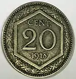 В 1918—1920 годах, наряду с никелевой «Парящей свободой», выпускали медно-никелевые 20 чентезимо, получившие название «Esagona» (рус. Шестиугольник). Своим названием они обязаны характерному виду, а именно помещённым обозначению номинала и году выпуска в шестиугольник на реверсе. Монета выпущена в качестве чрезвычайного выпуска для нормализации денежного обращения Италии после Первой мировой войны. Монетный кризис заключался в нехватке наличных денег в обороте, то есть демонетизации экономики. Золото и серебро исчезли из оборота, население начинало накапливать монеты и из неблагородных металлов. В этих условиях страна стала испытывать нехватку разменной монеты. Для насыщения рынка и был произведён чрезвычайный выпуск нового типа 20 чентезимо из медно-никелевого сплава. По своему составу, весу и размерам они соответствовали монетам того же номинала 1894—1895 годов времён правления Умберто I, которые до этого с 1909 по 1914 год выводили из оборота[5]. С 1923 года 20 чентезимо «Esagona» стали выводить из оборота. Официально их демонетизировали 31 июля 1947 года[6].